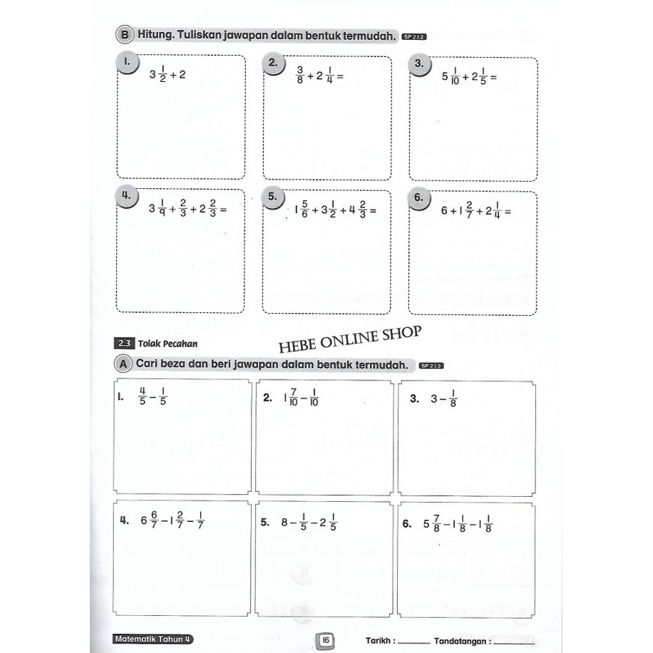 Penaakulan bukan saja mengubah paradigma murid dari sekadar belajar kepada berfikir, malah memberi pengupayaan intelektual apabila murid dibimbing dan dilatih . Dapatkan soalan latihan matematik tahun 4 pecahan yang berguna khas untuk murid lihat pekeliling terbaru kerajaan . 3 4 5 + + Koleksi soalan latih tubi matematik tahun 4. Sesuai untuk memantapkan kefahaman matematik pelajar dan juga boleh dijadikan bahan latihan . Upload ini khas untuk guru matematik tahun 4 yang inginkan soalan tambahan kepada murid lemah matematik.sebagai rujukkan sahaja.full description .